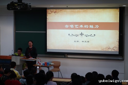 林玉赤老师从合唱团员的构成讲起,分为女声合唱、男声合唱、混声合唱。一个合唱团大致由女高音(Soprano)、女中音(Alto)、男高音(Tenor)、男低音(Bass或Baritone)四个声部构成,有的合唱团还会细分为十六声部。为了让同学们更好地感受齐唱、二声部轮唱、三声部轮唱的区别,林玉赤老师还邀请博士合唱团部分团员现场范唱了著名的合唱作品《黄河大合唱——保卫黄河》。合唱不同于齐唱,每个声部唱的旋律虽然不同,但交融在一起却有奇妙独特的和声效果。在合唱艺术中,声音始终是核心要素,如果说独唱追求的是个性,合唱追求的就是共性,因为合唱是整体的艺术,要求其歌唱发声的统一和谐,才能形成共性的艺术处理与情感表现。
