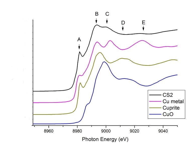 研究团队首先利用XRF技术,对样品不同呈色部位进行分析后发现,该样品红色区域铜含量明显偏高,而其余元素差别不大,因此表明铜是红色区域的主要致色元素。之后利用北京同步辐射实验站1W1B的XAFS技术,对红色区域进行XANES分析结果显示,铜的近边结构中,边前有较强的锐峰;边后特征峰表明,铜以不同价态混合比例存在,但金属铜是其主要存在形式。最后利用上海同步辐射15U实验站的μ-XRD进行分析,结果显示红色区域衍射特征峰均属于金属铜,确认了金属铜的致色。此外由于样品釉面呈乳浊效果,因此研究团队通过岩相与SEM对样品釉彩结构进行了分析和探讨。本研究结合多种技术手段,对中国早期铜红瓷的呈色机理作出了解释。