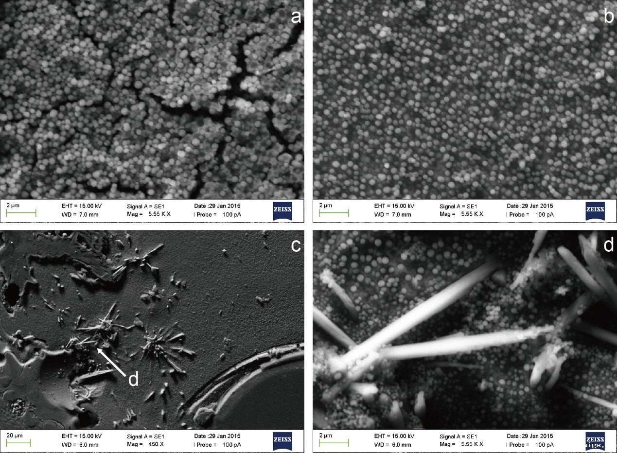 a为红色区域, 比例尺:2μm; b为白色乳浊区域,比例尺:2μm; c为析晶区域,比例尺:20μm; d为析晶区域局部放大图,比例尺:2μm。