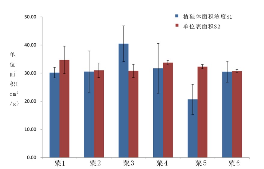 该研究首次将压点法应用到植硅体量化统计中。压点法是地球环境研究中对沉积物中显微炭屑进行面积浓度统计的常用方法之一。粟稃壳植硅体在埋藏和实验室提取中往往破碎成大小不一的碎片,这些碎片与炭屑的形态非常接近。研究者利用压点法对提取得到的稃壳植硅体进行面积浓度(S1,cm2/g)统计,并与测量得到的粟稃壳单位表面积(S2,cm2/g)进行比较(图3)。由于粟具有鉴定意义的植硅体由种子稃壳的表皮细胞产生,覆盖于整个稃壳上,因此,每粒粟的稃壳表面积与所产生的稃壳植硅体面积应当是一致的。本研究中S1与S2两者的数据同样非常接近,这一结果表明,压点法可以有效地对粟稃壳植硅体进行统计。
